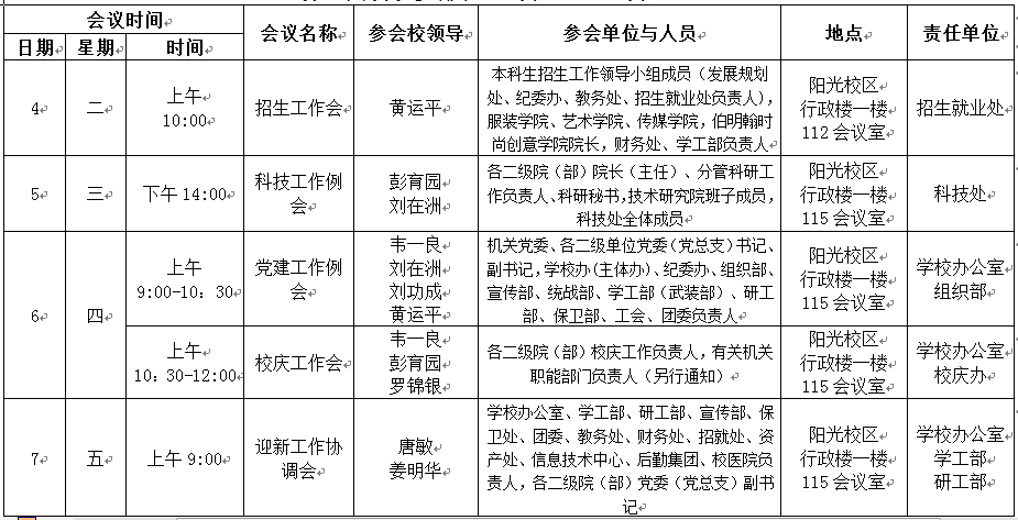 第一周会议安排表(9月3日—9月7日)
